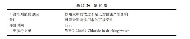 飲用水中的氯化物(見表12.26)主要有天然來源、污水排放和工業(yè)污染物、含有防凍鹽 的城市地表徑流和咸水侵蝕。 人對(duì)氯化物的主要暴露來自添加至食物中的鹽,并且從食物中攝入的氯化物遠(yuǎn)比從飲 水中取得多。