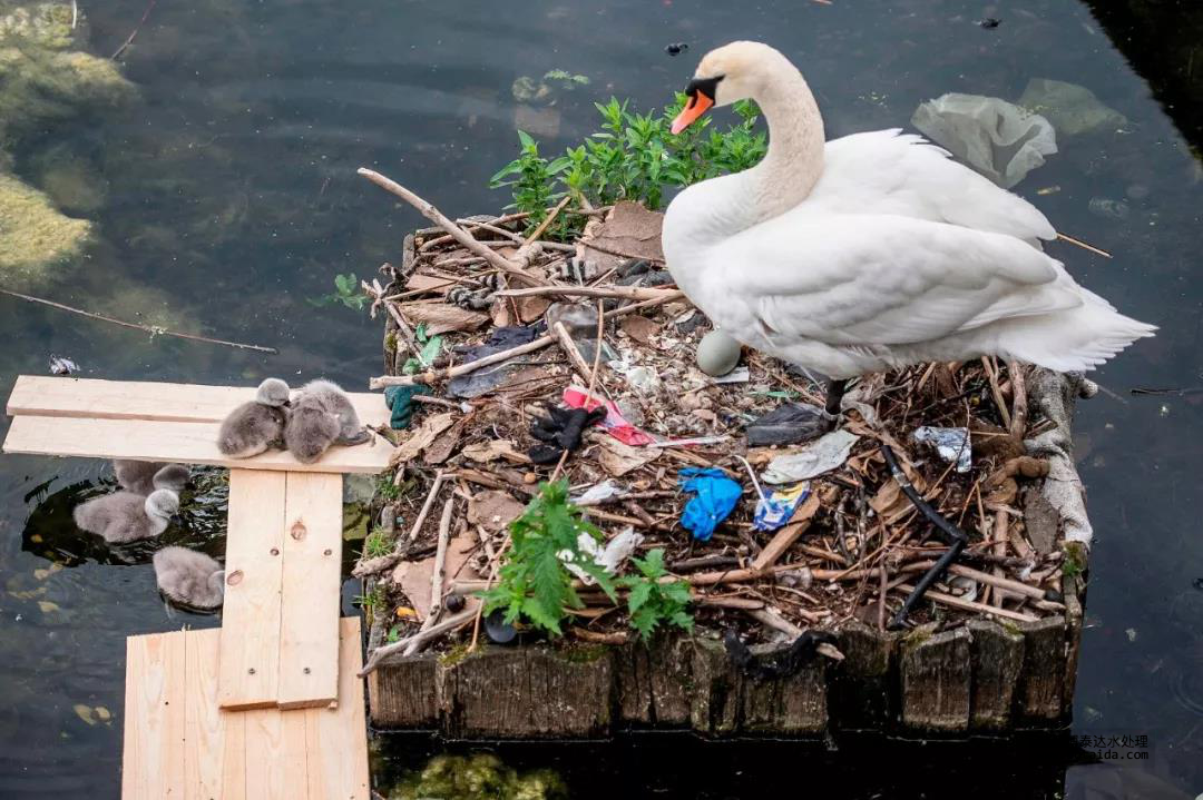 一只天鵝帶著幼鳥