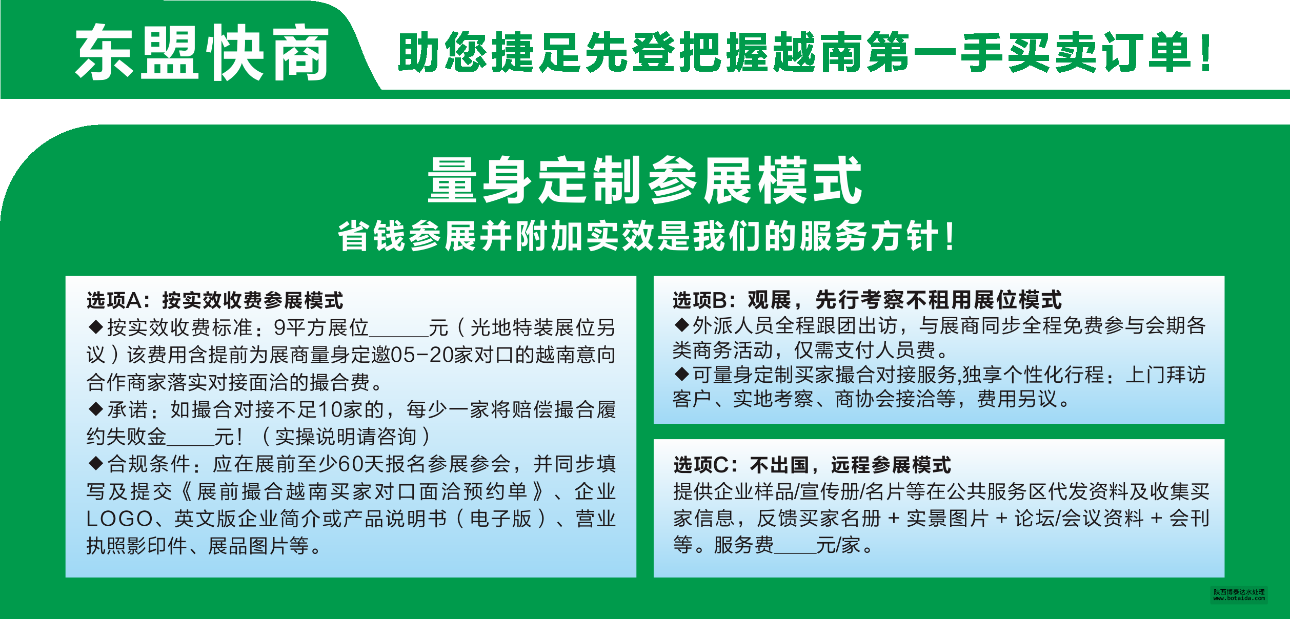 合規(guī)條件:應(yīng)在展前至少60天報(bào)名參展參會,并同步填寫及提交《展前撮合越南買家對口面洽預(yù)