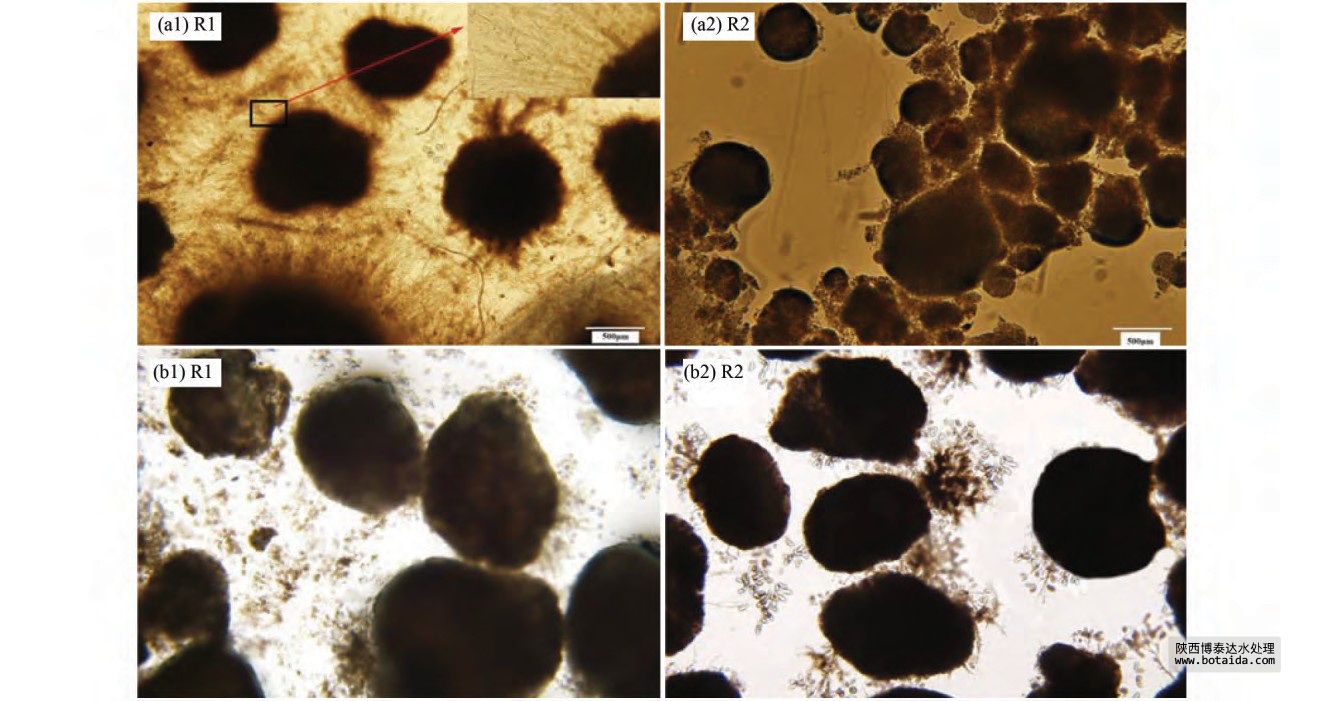 ( a1) R1 和( a2) R2 為 70 d 的顯微鏡照片,( b1) R1 和( b2) R2 為 130 d 的顯微鏡照片圖 3  R1 和 R2 反應(yīng)器中顆粒污泥的顯微鏡照片