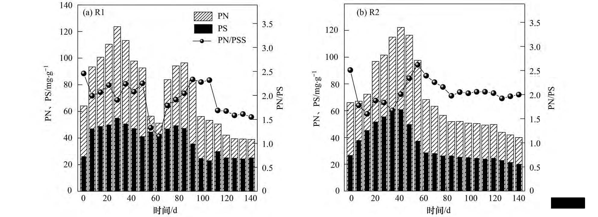 圖 4   R1 和 R2 反應(yīng)器中 PN、PS 和 PN / PS 值的變化