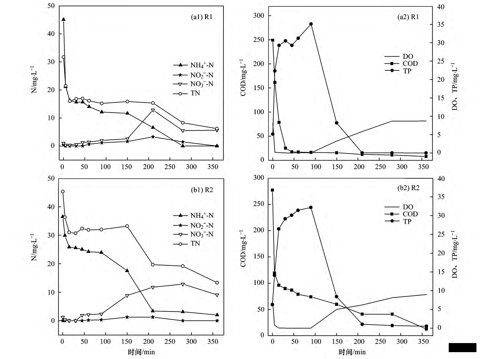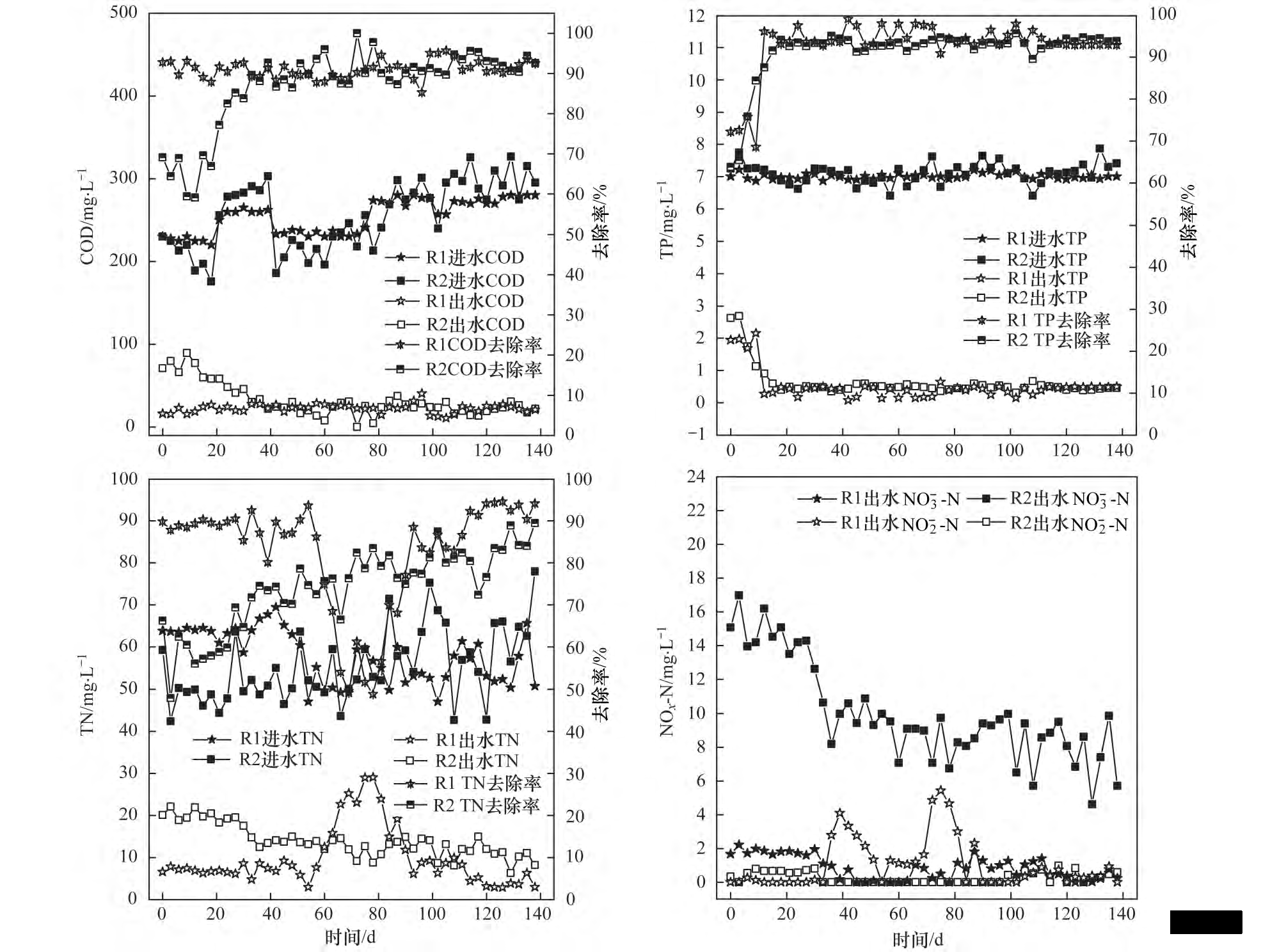 圖 5   R1 和 R2 反應(yīng)器去除 COD、TP、TN 和 NO - -N 的性能