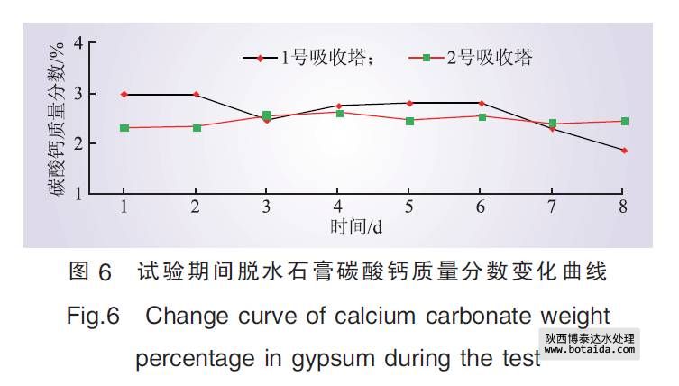 根據(jù)計劃進行臨時管路系統(tǒng)安裝, 從原工業(yè)廢水系統(tǒng)清水池清水泵出口母管直接引出一路管道至1、2號脫硫塔間的地坑。由電廠原有的坑泵將處理后的工業(yè)廢水輸送入脫硫塔工藝用水點, 同時在管路上增設(shè)電動調(diào)節(jié)閥和電磁流量計。首次補入地坑120 m3處理后的工業(yè)廢水, 待地坑內(nèi)坑泵開啟將其輸送至脫硫系統(tǒng)后, 監(jiān)測脫硫塔脫硫效率、石膏品質(zhì)變化; 在脫硫塔脫硫效率、石膏品質(zhì)穩(wěn)定無變化的情況下, 逐步補入處理后的工業(yè)廢水, 并以10 m3/d的梯度逐漸增加。若石膏品質(zhì)明顯下降, 則加大監(jiān)測頻率, 分析原因, 同時停止補入處理后的工業(yè)廢水。在調(diào)試好相關(guān)設(shè)備和儀表后開始進行試驗分析, 內(nèi)容包括脫硫系統(tǒng)整體運行狀況、脫硫效率、石膏品質(zhì)等。