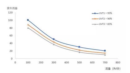 生物驗(yàn)證是通過向紫外線消毒系統(tǒng)加入目標(biāo)微生物,測定目標(biāo)微生物的滅活率,反推紫外設(shè)備的劑量及消毒性能的。首先,用紫外平行光儀均勻照射已知濃度的目標(biāo)微生物樣品,檢測照射后微生物濃度以確定滅活率。根據(jù)紫外強(qiáng)度、暴光時間等試驗(yàn)因素,計算微生物的紫外線照射劑量,最終得到目標(biāo)微生物的紫外線劑量-滅活率曲線。然后,進(jìn)行紫外線反應(yīng)器的測試,將驗(yàn)證微生物加入到紫外線消毒系統(tǒng)的上游,在確定流量、UVT、UV功率等條件下,測定目標(biāo)微生物的滅活率。根據(jù)檢測結(jié)果以及上述紫外線劑量-滅活率曲線,可得在不同紫外燈輸出功率和不同紫外線穿透率條件下,紫外線水消毒設(shè)備處理流量-劑量關(guān)系曲線,如圖1所示。圖1中UVT為水體紫外穿透率,橫坐標(biāo)為設(shè)備所處理的流量,縱坐標(biāo)為設(shè)備的實(shí)際劑量。