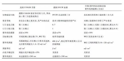 對比國內(nèi)外驗(yàn)證標(biāo)準(zhǔn),美國UVDGM手冊適用范圍相對較小。UVDGM手冊主要針對公共供水系統(tǒng)消毒,手冊中涵蓋了實(shí)施紫外線消毒系統(tǒng)的許多方面,但并沒有全面介紹所有類型的紫外線消毒系統(tǒng)、設(shè)計替代方案以及驗(yàn)證協(xié)議。德國DVGW標(biāo)準(zhǔn)適用于所有紫外線殺菌設(shè)備,目標(biāo)病原體涵蓋范圍廣。中國《紫外線水消毒設(shè)備紫外線劑量測試方法》(GB/T 32092—2015)分別對飲用水、再生水和污水規(guī)范了不同的目標(biāo)微生物,涉及范圍廣。表1為國內(nèi)外驗(yàn)證標(biāo)準(zhǔn)的對比,這些規(guī)范指導(dǎo)原則不同,但都推動了紫外線技術(shù)在全球范圍內(nèi)的推廣和運(yùn)用,為公共飲用水安全保障做出了貢獻(xiàn)。