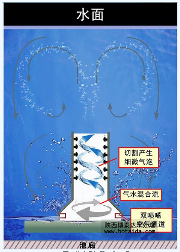 旋流曝氣器在工作過程中,氣體從底部法蘭口進(jìn)入后從緊貼鐘型曲面的 2 個(gè)噴嘴噴出形成旋流效果,以極快的速度沿著鐘型壁面向上加速回旋。由于鐘型上側(cè)漸漸狹窄,空氣獲得極大的加速度和沖擊力。 由于氣體作用,混合液在筒內(nèi)、外循環(huán)流動(dòng),氣液上升過程中,被筒內(nèi)部結(jié)構(gòu)多次碰撞切割,形成大量超微氣泡,且與周圍的泥水混合物充分混合,增加了氧氣的傳質(zhì)速率和氧利用率;充分混合的氣水猛力向上沖出,強(qiáng)烈的循環(huán)水流使部分小氣泡和水流返回池底,同時(shí)使底部淤泥參與循環(huán),因而整個(gè)曝氣池內(nèi)無充氧盲區(qū),實(shí)現(xiàn)了曝氣池容積利用最大化。(見圖3)