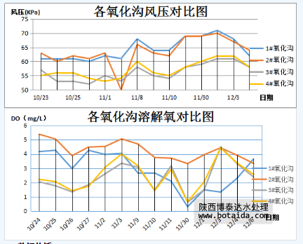 旋流曝氣器會(huì)卷吸起底部的泥水混合物,旋流曝氣器會(huì)將藏在底部污泥中的部分有機(jī)物進(jìn)一步消化分解,故在運(yùn)行初期,旋流曝氣器產(chǎn)生的一部分溶解氧用來消解底部的污泥。故在運(yùn)行初期,安裝旋流曝氣器的3#、4#氧化溝溶解氧不高。隨著旋流曝氣器的穩(wěn)定運(yùn)行,池底堆積的污泥進(jìn)一步消解,氧化溝中額溶解氧進(jìn)一步上升。博泰達(dá)預(yù)測(cè),在未來數(shù)月內(nèi),3#、4#氧化溝內(nèi)的溶解氧會(huì)繼續(xù)上升,直至底部污泥消解殆盡。
