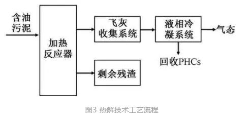 在無(wú)氧條件下,含油污泥經(jīng)高溫?zé)峤廪D(zhuǎn)化為氣、液、固三相,氣相產(chǎn)品以CH4、CO2、H2和CO為主,液相一般為常溫燃油和水,固相殘?jiān)泻薪固?,一般以回收液態(tài)PHCs為主,可不調(diào)質(zhì)達(dá)到回收目的。熱解反應(yīng)在還原氣氛下進(jìn)行,產(chǎn)二噁英極少,其典型工藝流程如圖3所示。