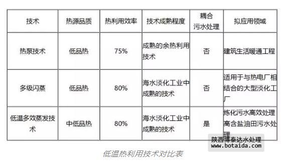 如低溫?zé)崂眉夹g(shù)對(duì)比表所示,較常規(guī)熱泵技術(shù)和多級(jí)閃蒸技術(shù),低溫多效蒸發(fā)在熱利用率、技術(shù)工藝耦合污水處理等方面具有明顯優(yōu)勢(shì),代表了相關(guān)技術(shù)領(lǐng)域的發(fā)展方向,是開(kāi)展余熱利用和污水處理耦合技術(shù)的重點(diǎn)方向。