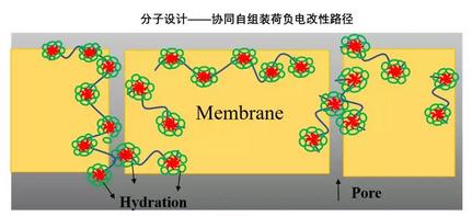 通過分子設(shè)計(jì),采用雙荷負(fù)電(兩親)嵌段共聚物自組裝形成的豐富而有序的拓?fù)浣Y(jié)構(gòu),對(duì)常規(guī)UF膜進(jìn)行協(xié)同自組裝荷負(fù)電改性,最終制得高度有序的不對(duì)稱均孔荷負(fù)電功能超濾膜。